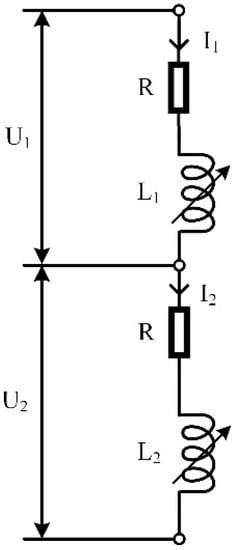 When the dual-coil inductive displacement transducer works, the effect of inductive core displacement on coil resistance is minimal and negligible. The dual-coil inductive displacement transducer converts the position change into an inductance change. The inductance of coil 1 is L1, the current is I1, and the voltage is U1. The inductance of coil 2 is L2, the current is I2, and the voltage is U2. The resistance of both coils is R. The equivalent circuit of the dual-coil inductive displacement transducer is shown in Figure 5 [16].
