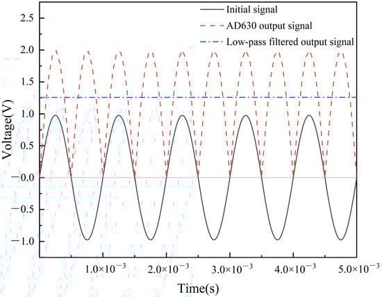 Figure 6 shows that the initial sinusoidal voltage signal is converted to a half-wave positive voltage signal with a voltage amplitude of 2 V after passing through the AD630 chip. After the low-pass filter, the voltage amplitude is 1.257 V. In the AD630 conditioning circuit, the frequency and phase of the modulating signal significantly affect the output signal. In Figure 7, the modulating signal has the same frequency as the input signal, and the phase difference is 0° when the output signal is a positive half-wave voltage. When the phase difference between the modulating signal and the input signal is 180°, the output signal is a negative half-wave voltage.