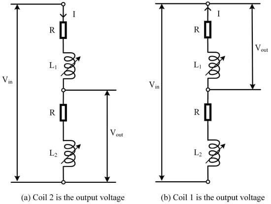 The dual-coil series three-wire (DCSTW) excitation method applies an excitation signal to both ends of the transducer, and the public terminal and the negative terminal of the excitation signal are used as outputs [26], as shown in Figure 8. Vin is the excitation signal, and Vout is the output signal. When the inductive core is displaced, the coil’s magnetoresistance changes and the inductive core’s displacement is characterized by detecting the voltage change in one of the coils. The inductive core is moved from one end to the other within the stroke, and the coil’s output voltage varies within a specific range. Figure 8a detects the voltage of coil 2, and Figure 8b detects the voltage of coil 1. The two excitation methods have opposite voltage polarity and opposite current directions.