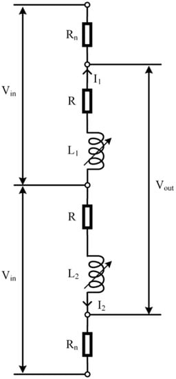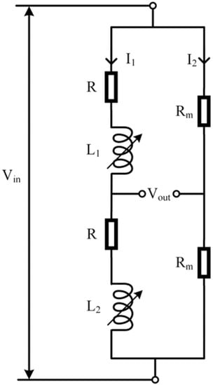 The dual-coil series four-wire (DCSFW) excitation method is a differential bridge connection [27,28], where two matching resistors Rm are connected in series and then in parallel with two series coils. This is a common excitation method today. The two terminals of the parallel circuit are the excitation signal inputs, and the public terminal of the transducer and the public terminal of the two series resistors Rm are the signal outputs, as shown in Figure 9. I1 is the current flowing through the coil, and I2 is the current flowing through the matching resistor. The bridge is in equilibrium when the inductive core is in the middle position and the output voltage Vout is 0 V. As the inductive core moved to coil 1, the voltage of coil 1 increased, and the voltage of coil 2 decreased. The voltage on the right side of Vout was higher than on the left side, and the current direction was leftward. As the inductive core moved to coil 2, the voltage of coil 1 decreased, and the voltage of coil 2 increased. The voltage on the left side of Vout was higher than the voltage on the right side, and the current direction was rightward. This circuit is used to characterize the displacement of the inductive core by comparing the voltage difference at the junction of the parallel branches. If a positive voltage is an output when the inductive core moves to coil 1, a negative voltage is an output when the inductive core moves to coil 2. This circuit not only measures the displacement magnitude but also determines the direction of displacement. To ensure the bridge is balanced, Z1 = Z2 = Z, where Zm is the impedance of Rm. The resistance value of the matching resistor is determined by [29]