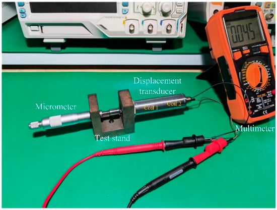 In this study, a dual-coil inductive displacement transducer, DIPT16, was used. To investigate the effect of different excitation methods on the output performance of this transducer, Multisim software was used to simulate the three excitation methods. Since the coil of the displacement transducer is equated to inductance and resistance in series, it is necessary to test the resistance and inductance of the coil in DIPT16. A displacement transducer test device was made, and a multimeter was used to test the resistance and inductance, as shown in Figure 11.