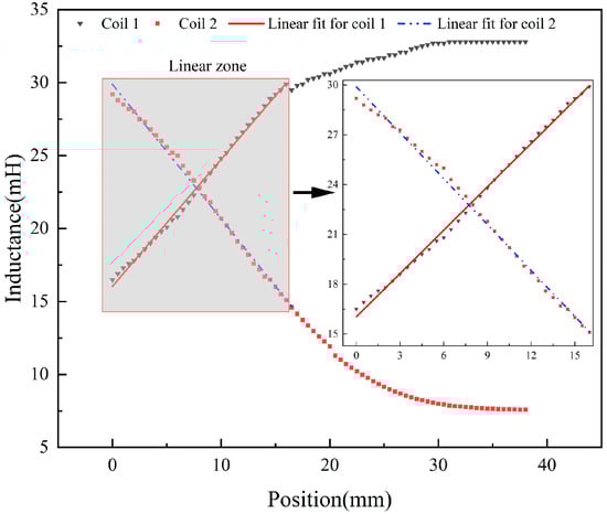Equation (11) holds if the length of the solenoid coil is infinite. For a finite-length solenoid coil, the magnetic field strength at the end of the solenoid coil is smaller than the center position. When the sensing core moves to the left, the increased inductance of coil 1 is smaller than the reduced inductance of coil 2.