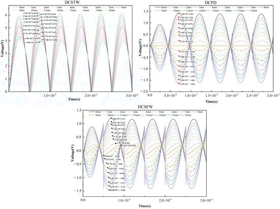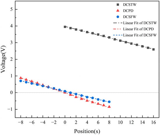 As seen in Figure 14, the DCSTW can only provide a single-direction displacement test, while the DCPD and DCSFW can complete a bi-directional displacement test. The amplitude variation of DCSTW is 2.19 V. The variation in amplitude of the positive displacement of the DCPD is 1.42 V, the variation in amplitude of the negative displacement is 1.64 V, and the average variation is 1.53 V. The variation in amplitude of the positive displacement of the DCSFW is 1.21 V, the variation in amplitude of the negative displacement is 1.46 V, and the average variation is 1.34 V. The variation in amplitude of DCSTW is 1.43 times greater than DCPD and 1.63 times greater than DCSFW. The variation in amplitude of the DCPD is slightly greater than the DCSTW. As a result, single-direction displacement detection has a significant amplitude variation and high resolving power. DCPD and DCSFW have roughly the same amplitude variation, with DCPD having the higher resolving power.