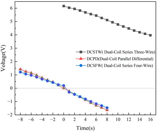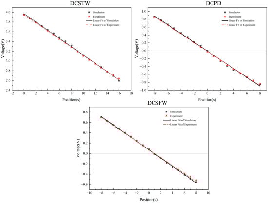As can be seen in Figure 16, the DCSTW has a linearity of 1.85% and a sensitivity of 84.75 mV/mm. The DCPD has a linearity of 2.80% and a sensitivity of 107.63 mV/mm. The DCSFW has a linearity of 2.02% and a sensitivity of 78.44 mV/mm. Therefore, DCSTW has better linearity, and DCPD has better sensitivity of the three excitation methods.