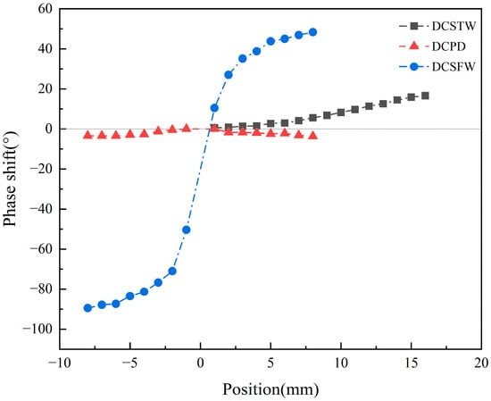 As shown in Figure 15, the DCSTW has a positive phase shift, and the more significant the inductive core displacement, the greater the phase shift, where the maximum phase shift is 16.67°. In the inductive core bi-directional displacement, the phase shifts of the DCPD are all negative, of which the maximum phase shift is −3.60° for the positive displacement and −3.36° for the negative displacement. The DCSFW has a positive phase shift of positive displacement with a maximum phase shift of 48.38° and a negative phase shift of negative displacement with a maximum phase shift of −89.48°. This shows that the DCPD has the smallest phase shift, and the DCSFW has the most significant phase shift. The phase shifts of the two coils in the DCPD counteract each other, whereas, in the DCSFW, the phase shifts of the two coils are superimposed, thus increasing the phase shift of the output signal. The DCPD excitation method should be used for bi-directional displacement detection to achieve better signal modulation.