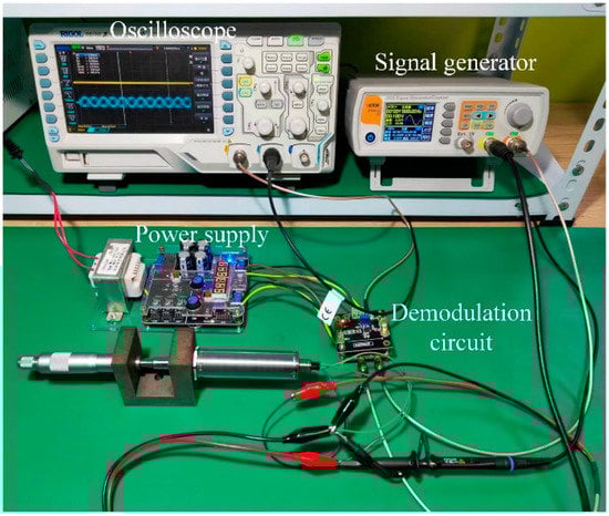 Based on circuit simulations, the program’s effectiveness was verified by experiments. The generator provided an excitation signal to DIPT16 and a modulation signal to the conditioning circuit. The conditioning circuit was powered by an adjustable power supply, and the demodulation circuit output signal was tested using an oscilloscope. It should be noted that the conditioning circuit is a two-module structure, where module 1 consists of an operational amplifier, an AD630 circuit, and a low-pass filter, and module 2 is a differential circuit. This structure was adopted because the DCSTW does not require differential circuits, and the DCPD and DCSFW do. Therefore, the DCSTW was tested using Module 1, and the DCPD and DCSFW were tested using both Modules. There were some differences between the experimental tests and the simulation. To reduce external interference, the operational amplifier was tuned with adjustable resistors. The experimental tests are shown in Figure 17.
