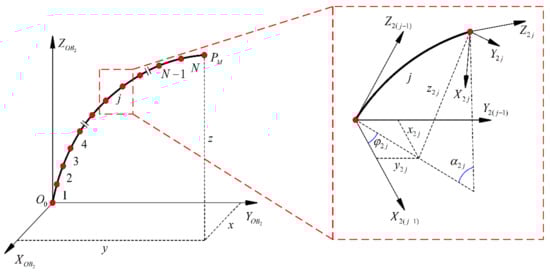 As shown in Figure 3, due to the twisting effect, the j-th segment generates a rotation angle φ2j around the z-axis with respect to the (j − 1)-th segment.