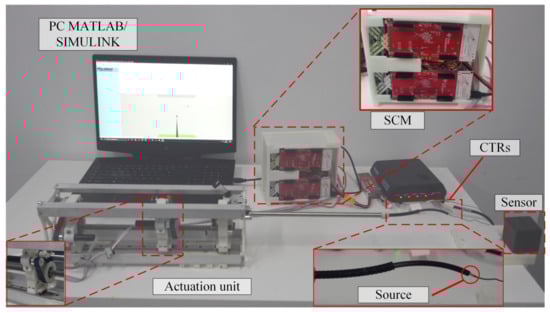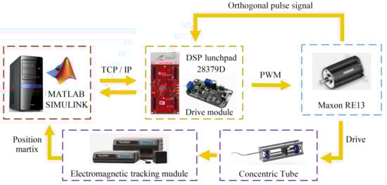 The experimental platform designed in this paper is shown in Figure 5. It consists of concentric tube robots, a driver, a controller, an upper computer, and a position measurement unit. The driver consists of four DC servo motors and a transmission mechanism. Of these motors, two control the rotation of two tubes, and the other two control the feeding of the two tubes. The angular positioning error of the servo motor is less than 0.5°, allowing for precise position control. The position measurement unit includes an electromagnetic wave source, a receiver, and a data collector. The receiver obtains the tip position and angle of the concentric tube robots by detecting the electromagnetic wave emission source at the tip of the concentric tube robot. In each experiment, a particular sampling frequency is used to collect the tip position data of the concentric tube robot. The position data are also sent to MATLAB to generate the motion path of the tip.