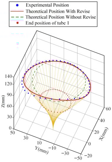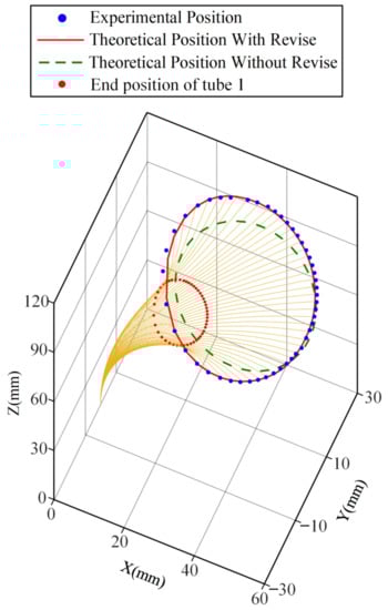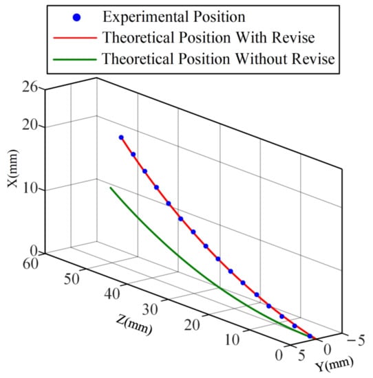 The end feed path is entered into the same coordinate system as the path predicted by the improved kinematic model and the path predicted by the previous model. Results are shown in Figure 7. The path predicted by the previous model has a significant deviation from the actual path. The error in the end position predicted by the previous model increases with the feed of the inner tube. Additional deflection of the inner tube induced by the clearance is the cause of this phenomenon. With a feed of 50 mm in the z-axis direction, the targeting position error of the previous model is close to 10 mm. It can be seen that the previous model cannot meet the needs of high precision, such as minimally invasive surgery.