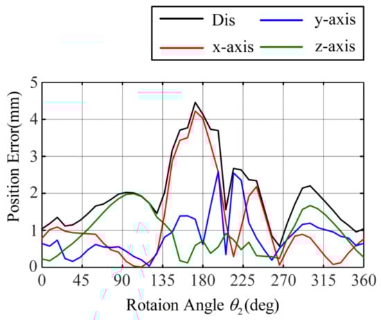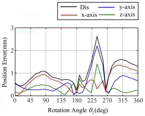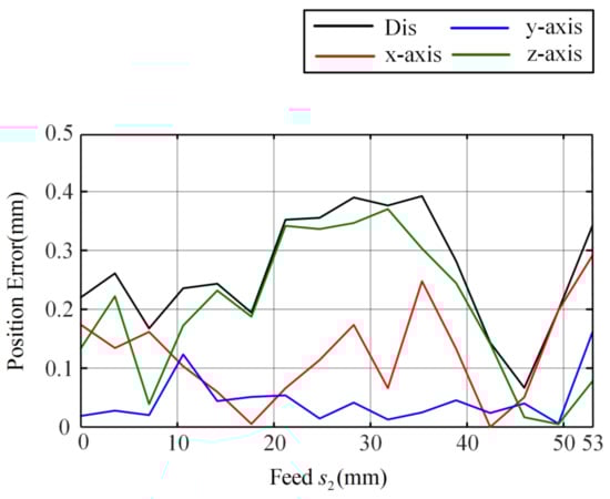 Due to the consideration of the deflection angle caused by the clearance between tubes in the concentric tube robot feed, the prediction result of the improved model for the path of the tip of the tube is very close to the experimental results. It can accurately predict the tip position during the whole process of inner tube feeding. Figure 8 shows the positioning errors of the improved model, where the maximum error is 0.38 mm in the x direction, 0.15 mm in the y direction, and 0.36 mm in the z direction, and the maximum error in space is 0.39 mm. This result demonstrates the excellent prediction ability of the improved model.