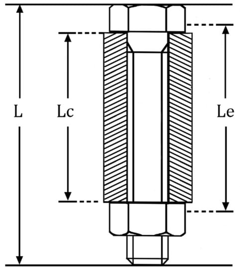 For bolts used to fasten connectors, the simplified structure is shown in Figure 1. When applying preload to the nut, only a part of the bolt structure is subjected to axial stress caused by the preloading force. Therefore, it is considered that the total length of the bolt at this time is composed of the effective length and the ineffective part without stress, as given by: