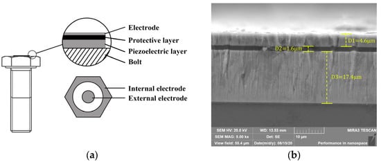 By changing the sputtering power, working pressure, and target base distance, the growth behavior of the piezoelectric coating could be changed. We found that the piezoelectric coating had the best piezoelectric effect when the sputtering power was 350 W, the sputtering pressure was 2.5 Pa, and the target substrate distance was 140 mm. At this point, the coating had a high c-axis orientation with only a (002) diffraction peak and it was easy to generate ultrasonic longitudinal wave. At the same time, in order to reduce shear wave generation and enhance the longitudinal wave signal as much as possible, the bolt was placed in the center and middle position. On this basis, the RF sputtering method and arc discharge method were used to prepare piezoelectric film sensor bolts. The bolt sensor diagram is shown in Figure 2a. The protective layer was a high-entropy alloy material with high resistance, and the electrode layer was Ti or Ag. Under the excitation of electric pulse, the piezoelectric film region covered by the electrode could excite ultrasonic longitudinal waves.