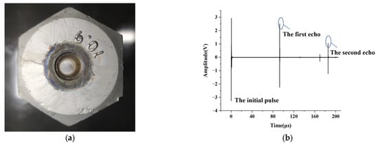 An ultrasonic measuring instrument was used to characterize the ultrasonic performance of the sensor. Figure 4a shows an M42 wind turbine tower bolt with the piezoelectric film sensor. Multiple echo signals could be received through the ultrasonic acquisition instrument. Figure 4b shows the ultrasonic signal and echo excited by the piezoelectric sensor at the top of the bolt. According to the bolt length and the velocity of the longitudinal wave in the 40CrNiMo material, it could be determined that the first echo of the longitudinal wave was about 91.316 μs, which is marked in the figure, and the subsequent longitudinal wave echoes were separated by a fixed period. Since the echo signal was affected by the propagation time of the electromagnetic wave in the cable, the difference between the two longitudinal wave echoes was used as the round-trip time in the bolt. Ultrasonic shear waves could also be observed between the two echoes, which was caused by the deviation of the bolt from the central position or an inappropriate Ar/O2 ratio during the deposition process.