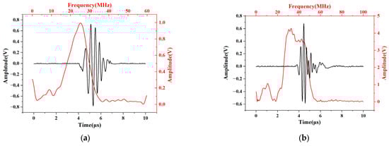 Pulse–echo waveform and frequency spectrum for (a) M42 bolt; (b) M48 bolt.