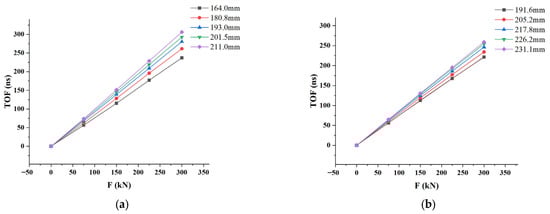 In the calibration experiment, it is necessary to measure the relationship between the variation in TOF and axial load under different clamping lengths , then take the derivative of Equation (11) with respect to F in order to obtain the slope under each clamping length: