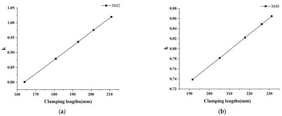 The slope under each clamping length was obtained by linear regression, then the corresponding relationship between different clamping lengths and slope k was obtained, as shown in Figure 7, and linear fitting was carried out. The regression equation of the M42 bolt could be expressed as , where the unit of is mm. The coefficient of determination was 0.999. Additionally, the regression equation of the M48 bolt could be expressed as , with a coefficient of determination of 0.999.
