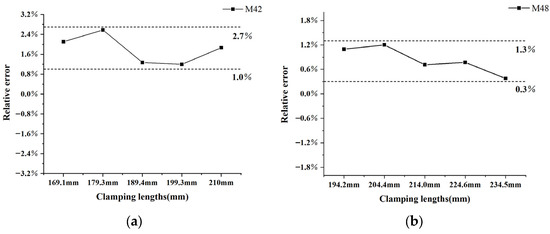 Measurement error of preload under different clamping lengths for (a) M42 bolt; (b) M48 bolt.