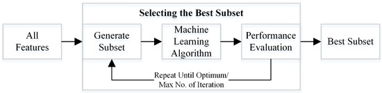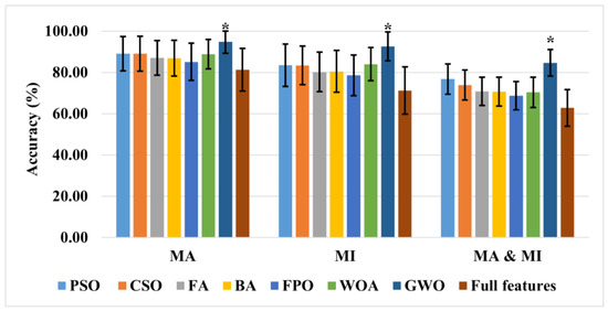 - Wrapper approaches with various metaheuristic optimization algorithms, such as particle swarm optimization (PSO), cuckoo search optimization (CSO), the firefly algorithm (FA), the bat algorithm (BA), flower pollination optimization (FPO), the whale optimization algorithm (WOA), and grey wolf optimization (GWO), were applied to observe the classification performance using a k-nearest neighbor (k-NN) approach.