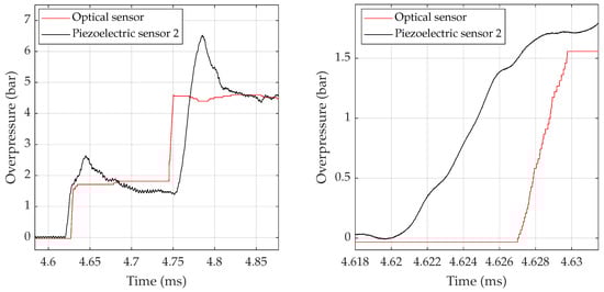 Comparison between an SMI sensor computed pressure change (red solid line) and the piezoelectric sensor 2 (black solid line). Zoom on the steps of pressure and (left plot). Close-up of the first rise (right plot).