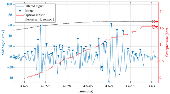 In Figure 3, the close-up on the rise of the pressure step is plotted for both pressure change sensors (red solid line for the SMI sensor and black solid line for the piezoelectric sensor) as well as the SMI sensor signal after bandpass filtering (blue solid line) with highlighting of the detected fringes that are taken into account for the reconstruction of the pressure change.