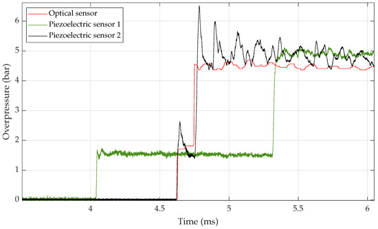 Figure 4 shows the response with time of the SMI sensor with bandwidth 20 MHz (red solid line), the piezoelectric sensor 2 (black solid line) located approximately in the same plane as the reference and the piezoelectric sensor 1 (green line) located about 25 cm before the other sensors (in the driven section). The reference piezoelectric sensors indicate a first overpressure step around 1.6 bar and a second overpressure step of about 5.4 bar. We can also see oscillations in phase opposition on both sensors that are in the same plane. This aspect will be discussed in the next section.