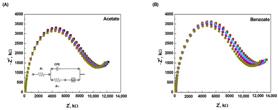 Comparison of EIS response obtained during EIS measurements with urea-derivative-modified graphite (A) and platinum (B) electrodes toward carboxylate anions. Experimental conditions: aqueous solution of 5 mM K3[Fe(CN)6]: K4[Fe(CN)6] (1:1) with the addition of 0.05 M KCl. Colors: acetate (black), benzoate (red), homovanillic acid (HVA, green), vanillylmandelic acid (VMA, blue).