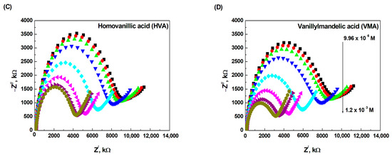A decrease in impedance was observed with an increase in both the VMA and the HVA concentration, as evidenced by the decreasing height and diameter of the semicircle. The binding of the analyte onto the modified surface often leads to an increase in its resistance [17,18]. However, a less well-known phenomenon can also occur, in which the impedance of the modified surface is decreased after the binding of analytes [19,20,21,22,23]. The reason for such behavior may be heterogeneity effects, doping with anions, or a partial ionic exchange at the interface between the electrolyte and electrode surface. The morphology of the electrode material should be taken into account (Figure S3).