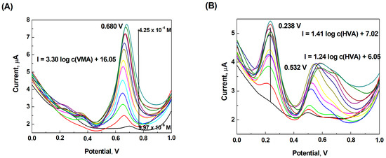 DP voltammograms of VMA (A) and HVA (B) recorded at G/Receptor modified electrode in phosphate-buffered saline at pH = 6. Concentrations: 9.97 × 10−6 M (black), 1.99 × 10−5 M (red), 3.99 × 10−5 M (green), 7.97 × 10−5 M (blue), 1.19 × 10−4 M (cyan), 1.58 × 10−4 M (magenta), 1.97 × 10−4 M (yellow), 2.35 × 10−4 M (dark yellow), 2.74 × 10−4 M (dark blue), 3.12 × 10−4 M (purple), 3.50 × 10−4 M (burgundy), 3.87 × 10−4 M (olive), 4.25 × 10−4 M (dark cyan).
