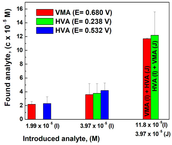 The experimental findings showed that (i) 1.99 × 10−5 M is the determined concentration for VMA (Ea = 0.680 V, Sr = 0.12, recovery 110%) and HVA (Ea2 = 0.532 V (Sr = 0.28, recovery 115%) in model samples; (ii) the peak at Ea1 = 238 V can be used for the quantification of HVA both in the absence and presence of a structural analogue from a concentration of 3.97 × 10−5 M; (iii) VMA has a greater interfering effect than HVA (Figure 7). The interfering effect of VMA could result from its high affinity to the urea moiety due to higher basicity, which is in agreement with experimental values of adsorption constants obtained from the EIS experiments (Table 2).