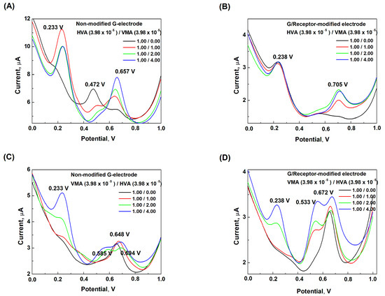 DP voltammograms for different ratios of HVA and VMA in mixture recorded at non-modified (A,C) and G/Receptor modified electrode (B,D) in samples of synthetic urine at pH = 6. For (D), the composition mixture is the same as for (C).