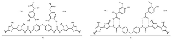 It was found that the electrochemical deposition of a supramolecular receptor through polymerisable units presumes the conservation of the main recognizing binding modes [10,12,14]. However, it is impossible to exclude the fact that the recognizing sites of a receptor deposited onto an electrode surface might interact with the electrode material and thus lose their capability to recognize the analyte of interest. The objective of this work was to compare the recognition capabilities of the urea moiety to discriminate structural analogues VMA and HVA on the surface of graphite and platinum electrodes. In this context, this work is a pilot investigation to examine the effect of the electrode surface material (platinum and graphite) on the discriminating ability of the urea moiety. It demonstrates the advantages of urea-derivative-modified graphite electrodes compared to non-modified ones at detecting VMA and HVA in a mixture.