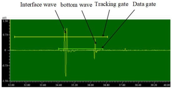 The analysis of the time-domain sampling signal using the time-of-flight (TOF) method has a serious impact on the accuracy of thickness measurement [17]. The gate tracking technique can be applied to identify the time-domain positions of the reflected echoes from the interface, as shown in Figure 1. For the thickness measurement, the selection of the ultrasonic waveform data containing the head and bottom waves is required for autocorrelation analysis to accurately derive the acoustic time difference.