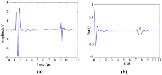 Ultrasonic echo signal graph and autocorrelation function curve for autocorrelation analysis. (a) Ultrasonic echo signal graph. (b) Autocorrelation function curve.