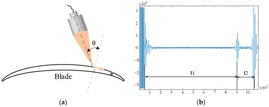 Nowadays, ultrasonic inspection, eddy current inspection, penetration inspection, and radiographic inspection are commonly applied to detect blades. Among them, eddy current inspection is more sensitive to surface and near-surface defects, but it is difficult to achieve internal defect detection. For penetration detection, the blade should be coated before detection, which is complex and costly, and it is also hard to identify internal crack defects in the blade. The radiographic inspection method is limited by the transmission method; it is of poor display clarity and is unable to effectively characterize internal crack defects. Ultrasonic inspection technology is commonly used in the thickness measurement and defect detection of aero-engine blades, and its use of ultrasonic leaky Rayleigh waves can achieve the detection of surface and subsurface crack defects [2,3]. Near surface defects are difficult to identify in the near surface blind zone because the defect echo always overlaps with the interface echo. Based on the combination of signal feature extraction and GA-SVM, near-surface defects can be quantitatively detected [4]. The probabilities of ultrasonic testing can be calculated as a function of defect size (POD curve) at different defect depths, which were generated based on the Monte Carlo simulation [5,6].