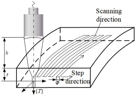 In Equation (5), t represents the depth of focus, and the water range can be calculated from Equation (5) according to the requirements of the detection depth so that the focus is located at the detection depth. For path planning of the surface detection shown in Figure 6, the tool coordinate system {T} is established at the focal point, the water range is kept as h, the step interval is approximated as half the diameter of the acoustic beam, and the incidence angle is kept coincident with the surface point normal or at a certain angle to achieve better coverage of the entire detection area.