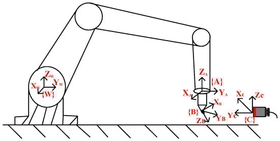 The coordinate system distribution of the robotic NDT system is shown in Figure 7. {A} denotes the tool coordinate system of the end flange of the robot, {B} denotes the workpiece coordinate system of the blade, {C} denotes the user coordinate system of the location of the ultrasonic transducer, and {W} denotes the reference coordinate system of the robot. In accordance with the robot kinematics theory, as long as the D-H parameters of the manipulator are determined, the relative locations of the tool coordinate system {A} and the reference coordinate system {W} can be deduced.