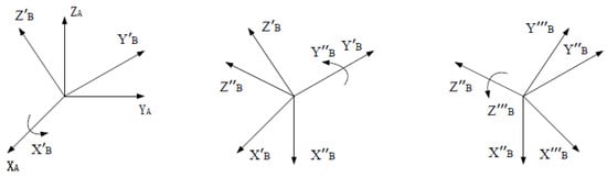 The TX90L manipulator used in the system is in accordance with the transformation order of the X-Y-Z Euler angles rotation matrix, as shown in Figure 8. In other words, the coordinate systems {XA, YA, ZA } are rotated by the α, β, and γ angles around the X, Y, and Z axes in the last rotational attitude to get the coordinate systems {,,}. Therefore, only the Euler angles between the trajectory points should be solved to comprehend their positional transformation.