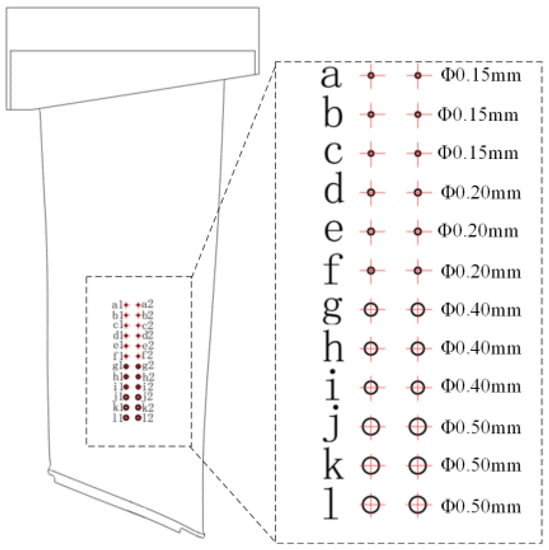 The main failure forms of aeronautical blades are fatigue, creep deformation, corrosion, oxidation, and surface degradation caused by overheating, and these forms of failure are concentrated at the blade body, inlet, and outlet edges. For example, corrosion occurs at the blade body, while cracks and defects are formed at the inlet and outlet edges, with the damage at the inlet edge being the most severe. To verify the defect detection performance of the robotic ultrasonic inspection system, a titanium blade with multiple defects of flat bottom holes and sub-millimeter cracks was selected, as shown in Figure 9 and Figure 10. To further verify the accuracy of the system in measuring blade thickness, we designed blade test blocks with stepped thicknesses based on the CAD model of the engine blade in the range of 2–12 mm, as shown in Figure 11.