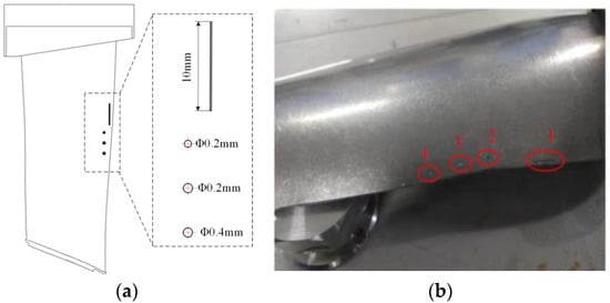 Artificial flat bottom hole and crack defects on air inlet side. (a) Prefabricated defect at blade edge. (b) Titanium engine blade.