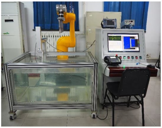 The six-degree-of-freedom industrial robot with high flexibility can effectively achieve multi-angle incidence of the acoustic beam on complex surfaces. The ultrasonic inspection system of the industrial robot developed in this study is shown in Figure 5.