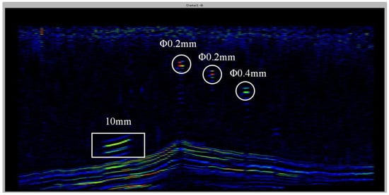 For the prefabricated defects at the blade inlet and exhaust side, we use ultrasonic longitudinal waves with the incidence angle greater than the second critical angle to generate the leaky Rayleigh wave. The ultrasonic transducer sweeps with a fixed angle along the inlet and exhaust side and the ultrasonic B-scan imaging is used for detection. As shown in Figure 13, it can be seen that the results are in line with the sizes and locations of the prefabricated defects. Therefore, this method can be used to detect the flat bottom hole defects with a diameter of 0.2 mm and crack defects with a width of 0.2 mm at the inlet and exhaust side of the engine blade, meeting the surface defects’ detection requirements for the inlet and exhaust side of the engine blade.