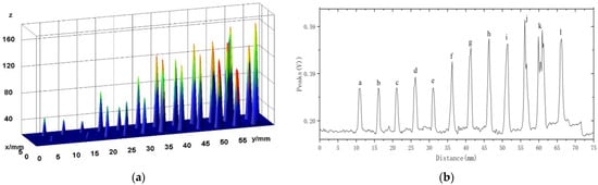 We extract the gray value of the defect in Figure 14a and convert the gray value of the image into signal amplitude; the obtained original amplitude curve and normalized results are shown in Figure 15. The figure shows that the difference between the echo and the noise signal amplitude strength of the smallest flat-bottomed hole defect with a diameter of 0.15 mm reaches −6 dB, which proves that the ultrasonic longitudinal wave vertical reflection method can effectively detect internal defects of the blade larger than this size. It can be seen from the curve that, in the case of the same depth, the larger the defect diameter of the flat-bottomed hole, the greater the maximum amplitude intensity of the echo signal, the wider the amplitude distribution range, and the larger the scanning imaging size of the defect. Therefore, the size of the defect can be compared with the variation range of the gray value in the C-scan image. Hence, the system can detect the standard flat bottom hole defect with 0.15 mm in diameter, meeting the detection requirements for quantitative analysis of defects.