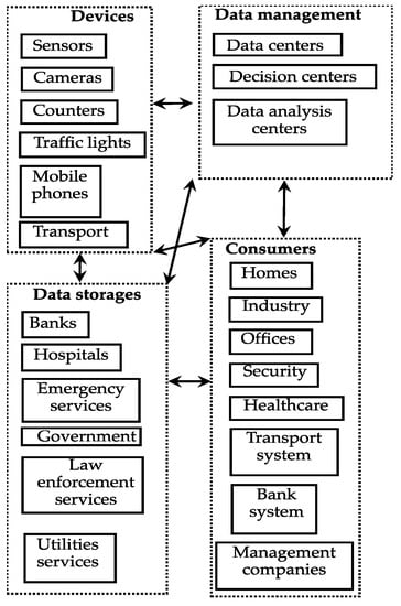 Let us consider the main hardware components of the smart city network. It consists of many elements, including video surveillance, emergency call systems, biometric systems, city and banking services, intelligent transport, and IoT solutions (Radio Frequency Identification [,], sensors for measuring temperature, humidity, illumination, pressure, etc.). Smart sensor networks play a substantial role in IoT. Their components include sensing, data collection, heterogeneous connectivity, data processing, etc. [,,].