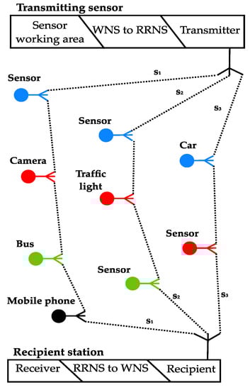 Let us consider the data transmission model presented in Figure 1 and Figure 2. It is known that MANET transmits data using devices located on the infrastructure-less, distributed wireless networks without static-located transmission stations. It is an interesting and promising solution providing communication of a big variety of devices, from mobile devices to personal cars, from smart devices to public transport, etc. In addition, a smart city infrastructure also contains static nodes, such as data centers, storage, decision centers, etc.