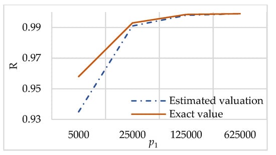 The question of how exactly it is necessary to choose the parameters of the SSS on the RRNS so that it has the asymptotic idealness property remains open. In [], the authors show the asymptotic idealness of the Asmuth-Bloom scheme using “sufficiently close” coprime numbers for RRNS moduli. The work [] considers so-called compact sequences of coprime numbers with an initial value when for some real number . In the following analysis, we assume that the compact sequences of coprime numbers are used as the moduli sets.