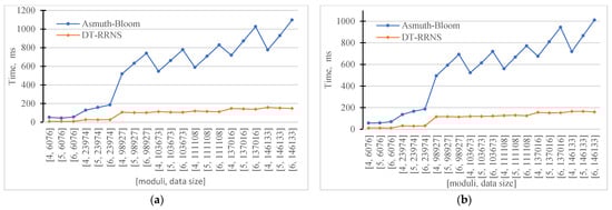 Figure 7 shows the encoding time (a) and decoding time (b) versus the number of moduli and data size. Figure 8 shows the redundancy versus the number of moduli and data size. DT-RRNS has lower redundancy close to 1. We see that the redundancy of both Asmuth-Bloom and DT-RRNS weakly depends on the input data. It varies with scheme parameters.