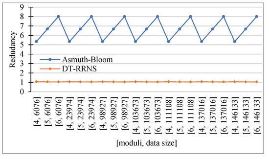 DT-RRNS shows better runtime results than Asmuth-Bloom. DT-RNS for the largest data size has less time than Asmuth-Bloom for the smallest data size when using 6 moduli. The redundancy for DT-RRNS is approximately the same for all moduli sets and data sizes. The redundancy of the Asmuth-Bloom is increasing with the number of moduli increasing.