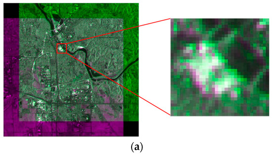 Figure 15 and Figure 16 show the resulting pseudocolor plots of the registration to the two sets of experimental data using BFSIFT, SAR-SIFT, and the method proposed here. In the pseudocolor diagram, green indicates the reference image, and purple represents the image to be registered. The two images are overlapped so that the registration effect of each method can be observed more clearly. The red rectangle box in the left image is the position of the right zoom-in in the original image. The SAR image registration obtained by the BFSIFT method and SAR-SIFT method did not accurately align the image to be registered to the reference image. The two overlapping images on the pseudocolor map have an obvious alignment error. The registration results of the proposed method have the best registration effect, and the reference image overlaps the image to be registered well.