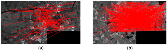 Both SIFT and SIFT-OCT are used to extract CPs in the master image (‘C’) and slave image (‘G’). However, the spatial distributions of the points from the SIFT and SIFT-OCT are quite similar, and presenting both results is not necessary. To clarify the proposed matching scheme is promising. The results of the original SIFT, which has been proven unsuitable for SAR, are presented and compared with the one-step scheme. The results of the different algorithms for the traditional one-step matching and proposed two-step matching are presented in Table 1. It can be seen from Table 1 that even for the original SIFT algorithm, which has been proven unsuitable for SAR image registration, the registration accuracy was substantially improved after the two-step matching method proposed in this paper, which is not much different from the registration accuracies of the other algorithms specifically proposed for SAR image registration. Thus, without specific instruction, only the results of the SIFT are presented in the following figures. The extracted keypoints of the SIFT are shown in Figure 4. In the master image, 25,096 and 7303 keypoints from the SIFT and SIFT-OCT, respectively, were extracted. In the slave image, 21,294 and 6589 keypoints from the SIFT and SIFT-OCT, respectively, were extracted. As the SIFT-OCT skipped the first octave of a scale-space pyramid, the number of keypoints from the SIFT-OCT is much smaller than that of the SIFT. However, the keypoints from the SIFT-OCT are more robust to multiplicative speckle noise than those of the SIFT.