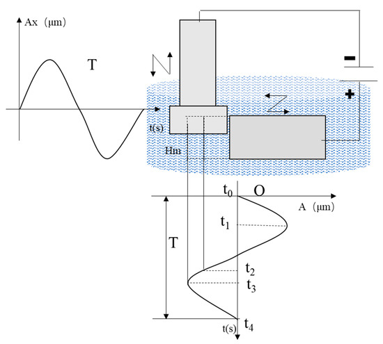 When the microcurrent density is less than the threshold value, no electrical machining occurs between the poles. In contrast, when the microcurrent density is greater than the threshold value, there is an effective electrolytic critical gap . It is assumed that there is an effective gap between the workpiece vibration balance and the tool. Additionally, when the voltage is less than 10 V for microfabrication, the interpolar gap is almost the same as that of RUEM and ECM, and the two-dimensional combined ultrasonic electro machining depth can be considered approximately equal to . The undeformed chip depth during normal grinding is linearly related to t and the indentation depth at the maximum coupling amplitude.